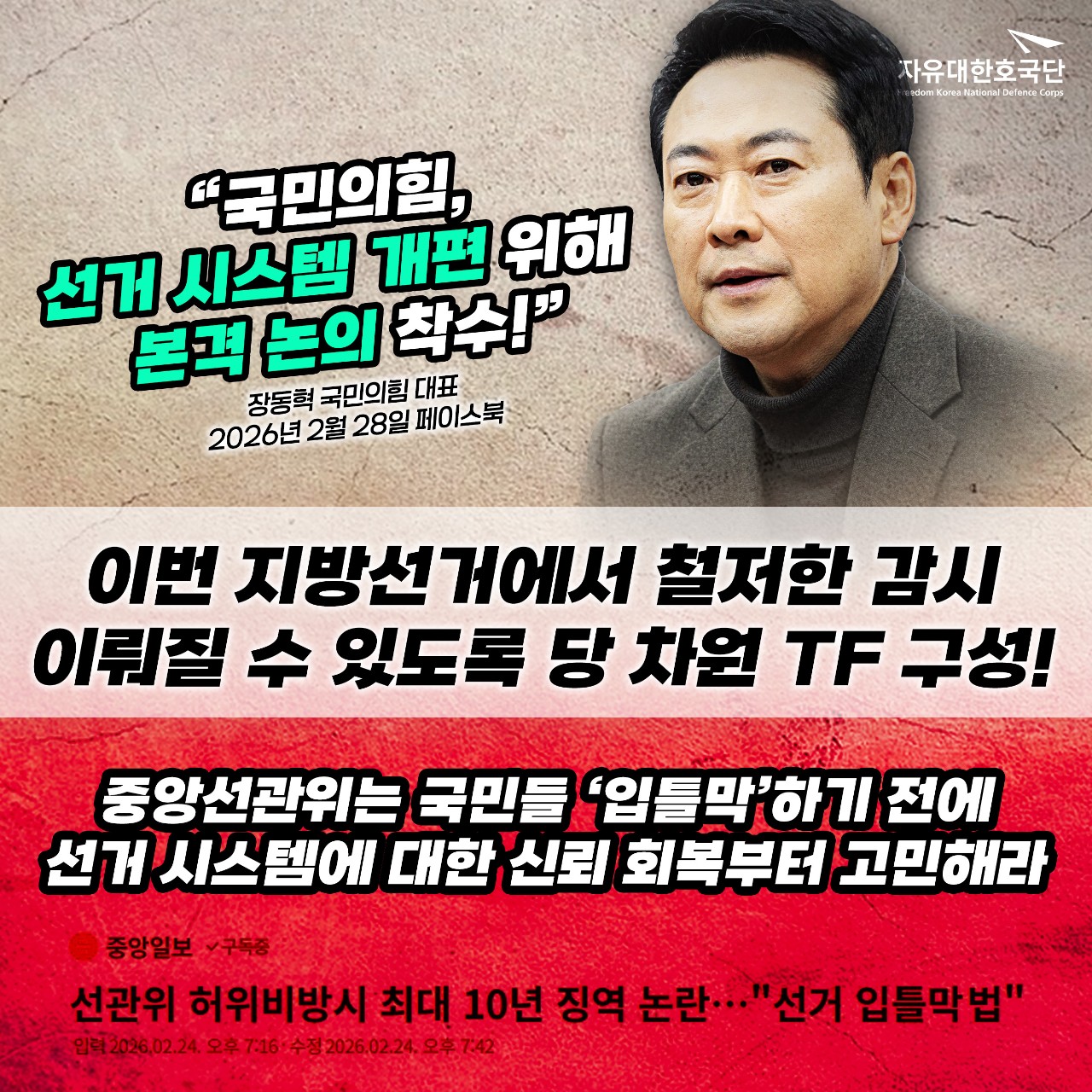 ±¹¹ÎÀÇÈûÀº ¼±°Å ½Ã½ºÅÛ °³Æí¿¡ ´ëÇØ º»°ÝÀûÀÎ ³íÀÇ¿¡ Âø¼öÇϰí, À̹ø Áö¹æ¼±°Å¿¡¼ öÀúÇÑ ¼±°Å °¨½Ã°¡ ÀÌ·ç¾îÁú ¼ö ÀÖµµ·Ï ´ç Â÷¿øÀÇ TF¸¦ ±¸¼ºÇϰڴÙ.